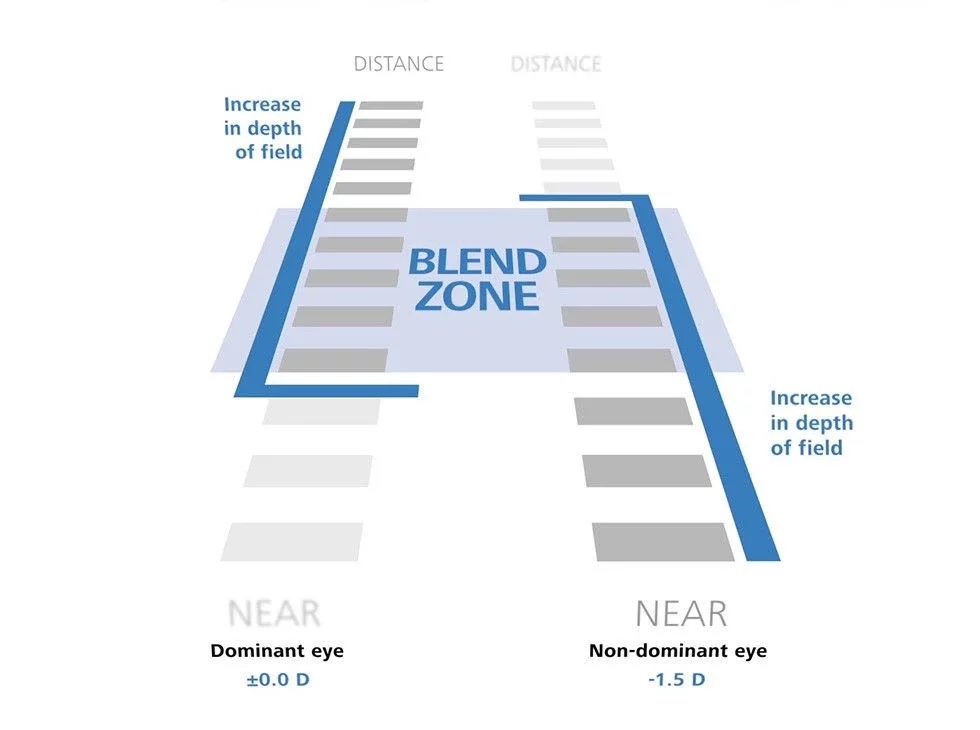 利用準分子激光打磨角膜,以矯正主力眼遠距離視力的屈光度數,及非主力眼的近距離視力的屈光度數。