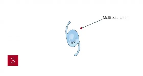 眼科醫生使用注射器將人工晶體植入眼睛。人工晶體從摺疊狀態自動翻開,並取代了原本晶狀體的位置,固定好人工晶體後即可完成。三焦點晶體除了矯正白內障,還能同時矯正老花和屈光不正的視力問題。